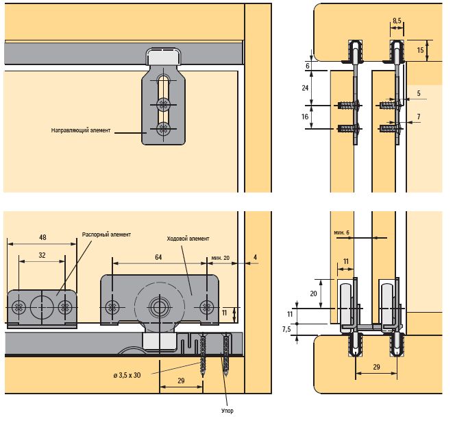 Концевой упор для правой и левой двери. Крепление внутри ходового профиля при помощи шурупов 3,5*30 мм, пластмасса серого цвета.