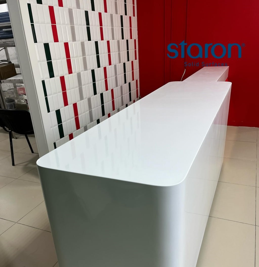Листы искусственного акрилового камня от Samsung Staron пользуются неизменной популярностью у обработчиков и дизайнеров благодаря своим свойствам. Можно покрыть практически любую поверхность, даже сложные изогнутые формы не станут проблемой. Коллекция Solid предлагает широкий спектр чистых цветов и уникальных оттенков, от белоснежного и светлого до глубокого черного и темного. Материал обладает высокой устойчивостью к воздействию различных факторов, таких как вода, тепло и химические вещества.