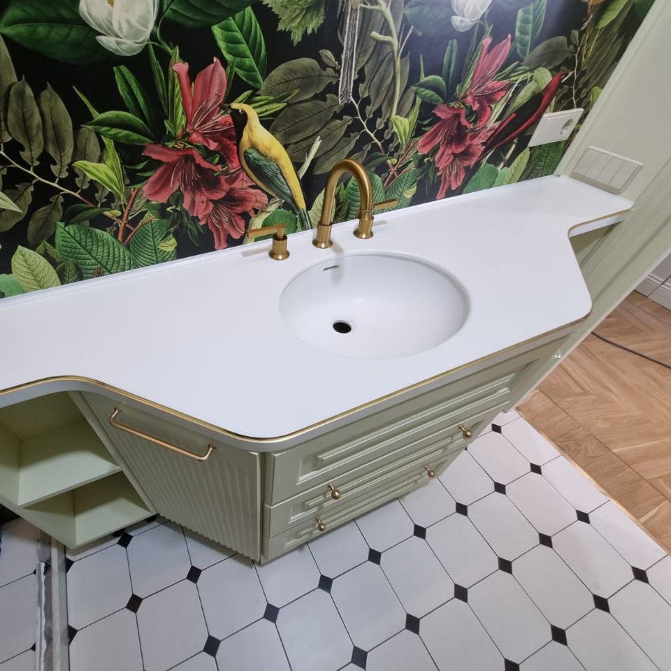 Коллекция Solid от Samsung Staron интересно работает в комбинации с цветами из других коллекций, можно создавать различные эффекты и комбинации переходов и пересечения текстур. С однотонными поверхностями, такими как Bright White BW010, получаются современные дизайнерские решения включающие в себя использование различных материалов: металл, стекло, древесина, бетон. Эти листы легко устанавливаются и могут быть использованы для отделки стен, создания столешниц, раковин, мебели, декоративных элементов.