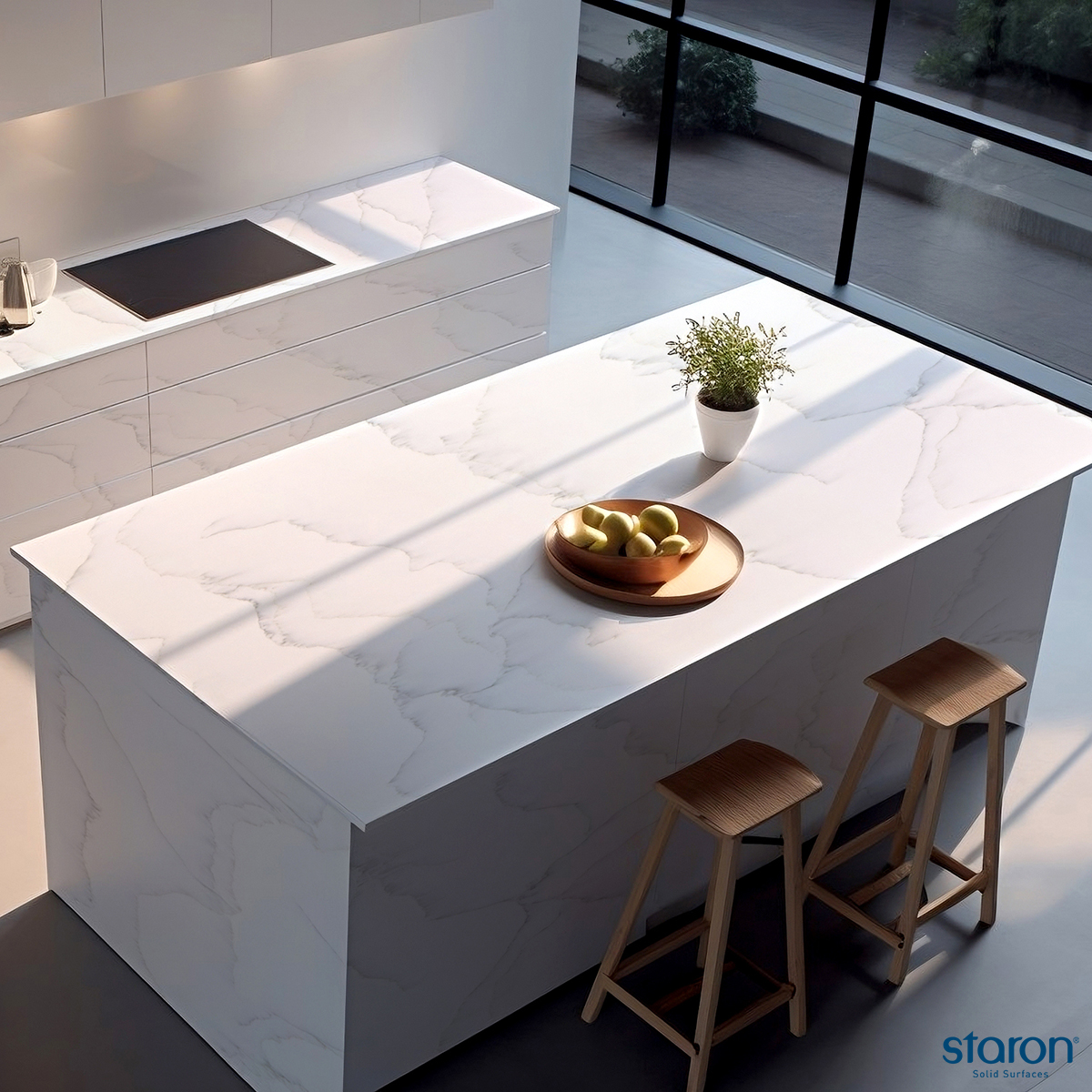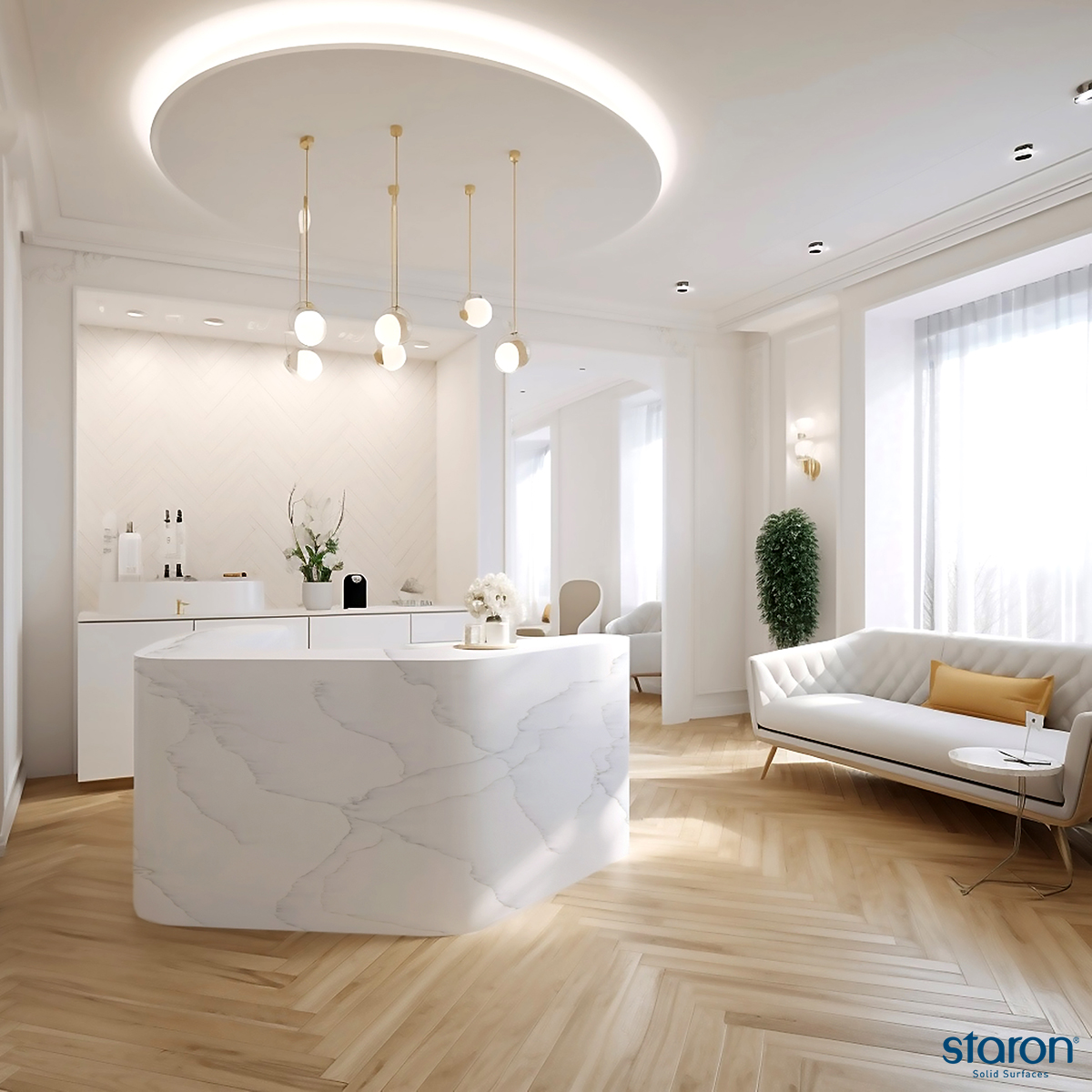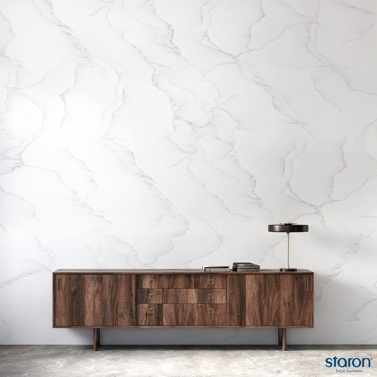 Поверхности из искусственного камня Staron коллекции Supreme придадут любому помещению современный, утонченный вид за счет широкой палитры декоров, повторения текстур природного камня и использования материала в сложных бесшовных и изогнутых архитектурных конструкциях, где требуется минимальный радиус изгиба.