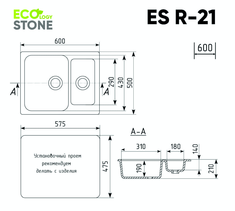 EcologyStone ES-21 – двухсекционная реверсивная кухонная мойка, с основной чашей и коландером. Данная мойка устанавливается в шкаф шириной от 60 см и является оборачиваемой. В комплектацию входят: сливная арматура с гофротрубой, технический паспорт и гарантийный талон. Существует возможность установки дозатора ULGRAN или других аксессуаров - доп. отверстие в таком случае потребитель делает самостоятельно с помощью фрезы Форстнера (не входит в комплектацию и приобретается отдельно). Заводская гарантия составляет 2 года, а срок службы данной мойки, при соблюдении основных правил ухода за ней, составляет более 10 лет.