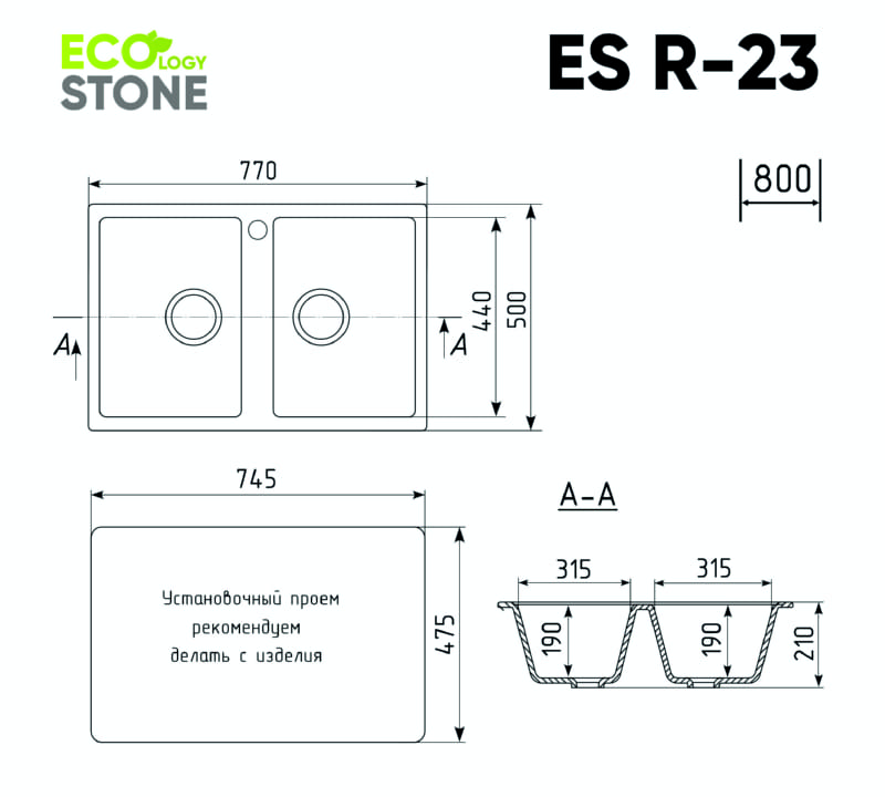 ЭколоджиСтоун ES-23 – двухсекционная кухонная мойка с отверстием под смеситель и двумя вместительными чашами. Данная мойка устанавливается в шкаф шириной от 80 см.