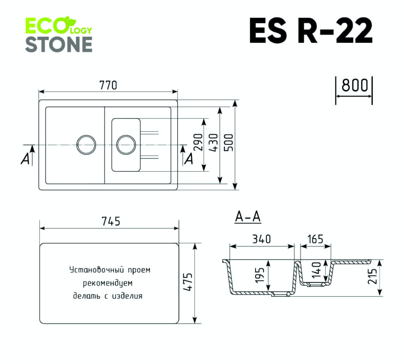EcologyStone ES-22 – двухсекционная реверсивная кухонная мойка, с основной чашей и коландером. Данная мойка устанавливается в шкаф шириной от 80 см и является оборачиваемой. В комплектацию входят: сливная арматура с гофротрубой, технический паспорт и гарантийный талон. Существует возможность установки дозатора ULGRAN или других аксессуаров - доп. отверстие в таком случае потребитель делает самостоятельно с помощью фрезы Форстнера (не входит в комплектацию и приобретается отдельно). Заводская гарантия составляет 2 года, а срок службы данной мойки, при соблюдении основных правил ухода за ней, составляет более 10 лет.