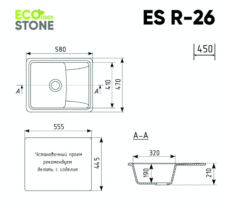 EcoStone ES-26 – односекционная компактная реверсивная кухонная мойка. Данная мойка устанавливается в шкаф шириной от 45 см и является оборачиваемой. В комплектацию входят: сливная арматура с гофротрубой, технический паспорт и гарантийный талон. Заводская гарантия составляет 2 года, а срок службы данной мойки, при соблюдении основных правил ухода за ней, составляет более 10 лет.