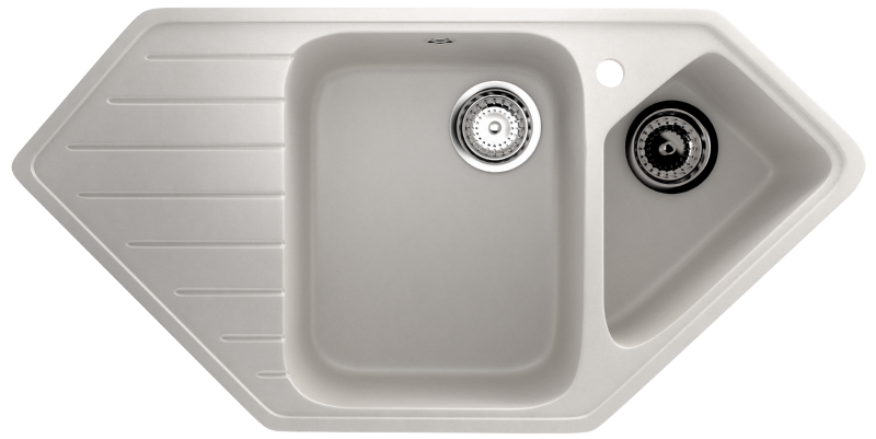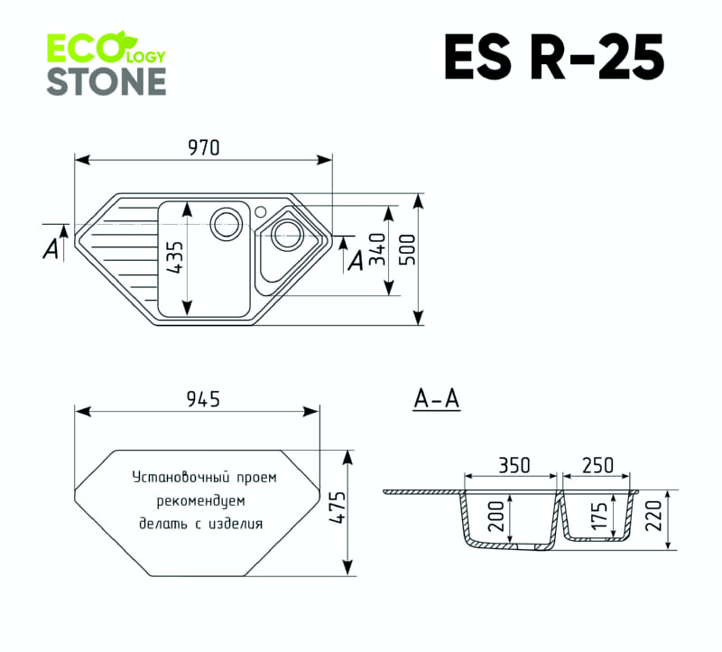 EcologyStone ES-25 – двухсекционная угловая кухонная мойка с отверстием под смеситель, с основной чашей и коландером. В комплектацию входят: сливная арматура с гофротрубой, технический паспорт и гарантийный талон. Существует возможность установки дозатора ULGRAN слева от смесителя – доп.отверстие в таком случае потребитель делает самостоятельно с помощью фрезы Форстнера (не входит в комплектацию и приобретается отдельно). Заводская гарантия составляет 2 года, а срок службы данной мойки, при соблюдении основных правил ухода за ней, составляет более 10 лет.