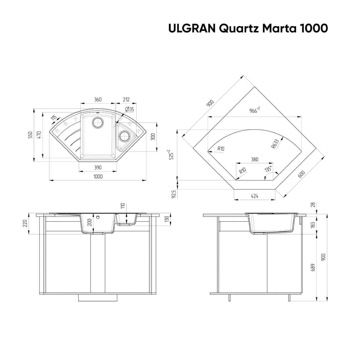 Кухонная мойка ULGRAN угловая двухчашевая, цвет космос (Marta 1000-08)
