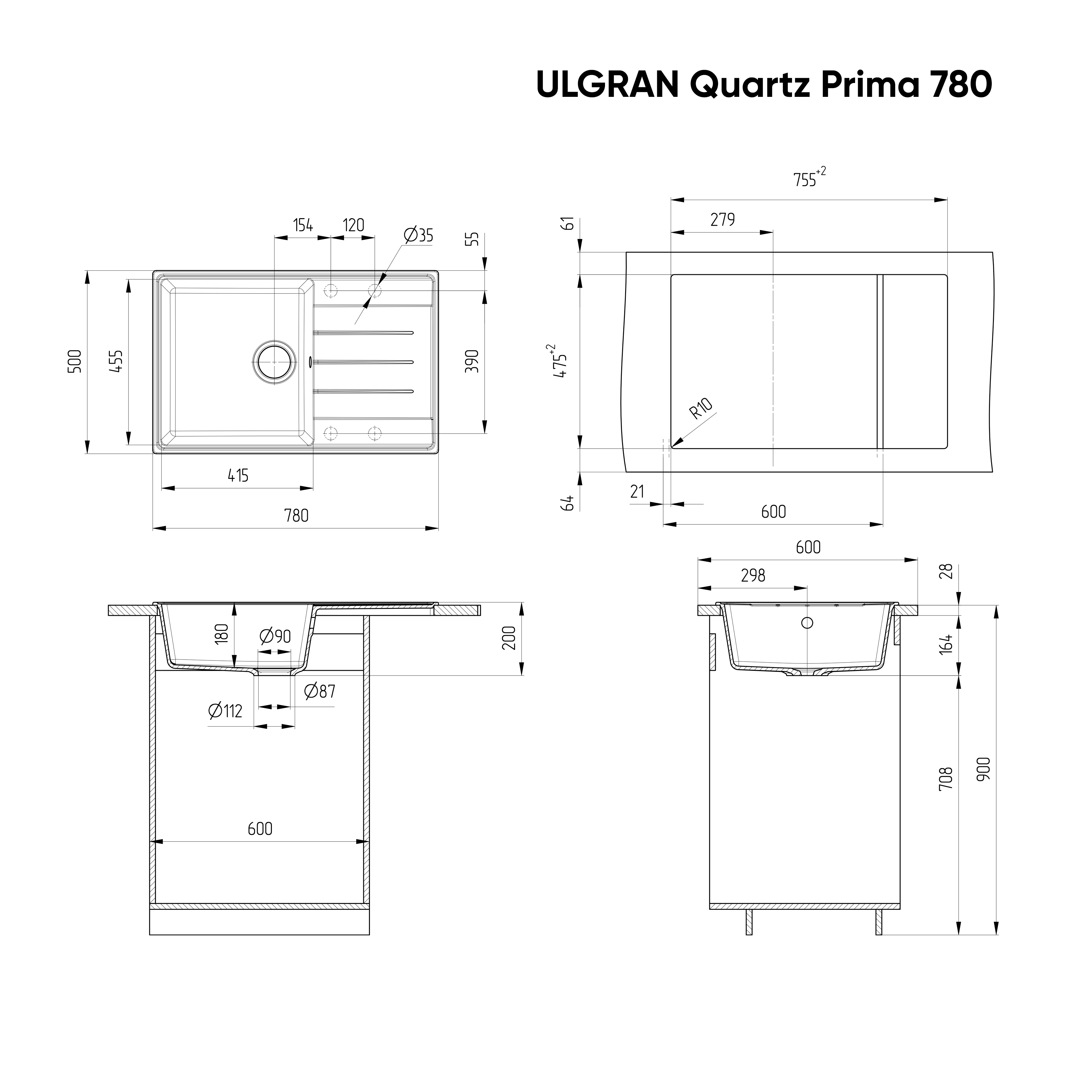 Односекционная кухонная мойка 780x500 реверсивная, глубина 180 мм, кварц, цвет уголь (Prima 780-07)