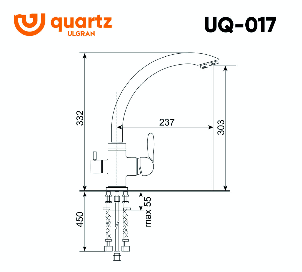ULGRAN Quartz UQ-017 - современный кухонный смеситель с дополнительным краном для подключения фильтрованной воды, оснащенный кран-буксой с керамическими пластинами. Реализован тройной подвод воды через один излив: холодная, горячая и фильтрованная. Переход с одного подвода на другой производится поворотом рычага. Набор для соединения с фильтром входит в комплект . Система фильтрации приобретается дополнительно и монтируется под мойку, специальный индикатор сообщает о необходимости замены картриджа. Материал корпуса выполнен из высококачественной латуни, а окрашивание под "искусственный камень" в цвет мойки ULGRAN Quartz выполняется на собственном производстве, что позволяет идеально попасть в фирменный цветULGRAN Quartz. В качестве керамического картриджа используется известный бренд Wanhai диаметром 35 мм с высокой пропускной способностью в 500 тысяч циклов "открывания-закрывания". На подвижные части картриджа Wanhai нанесена специальная невымываемая силиконовая смазка, а керамические пластины изготовлены из 96% оксида алюминия, что, в сочетании с высоким качеством шлифовки обеспечивает долговечность, надежность, плавность хода рукоятки. Смеситель оборудован съемным пластиковым аэратором для экономии воды и поворотным изливом на 360 градусов. В комплектацию входя: керамический картридж Wanhai, гибкая подводка, комплект крепежных элементов, кран-букса с керамическими пластинами для дополнительного излива для фильтрованной воды, набор для подсоединения фильтра питьевой воды (гибкая подводка + переходник-цанга), технический паспорт и гарантийный талон. Заводская гарантия составляет 3 года на материал корпуса, 1 год на комплектующие к смесителю и 1 год на материал покрытия.