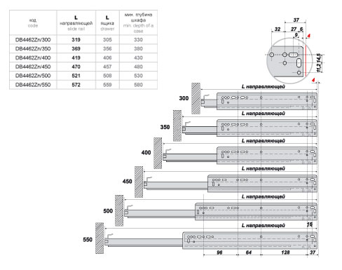 Направляющие шариковые, частичного выдвижения, с доводчиком, скрытого монтажа, 350 мм, компл. 2 шт. (DB4462Zn/350)