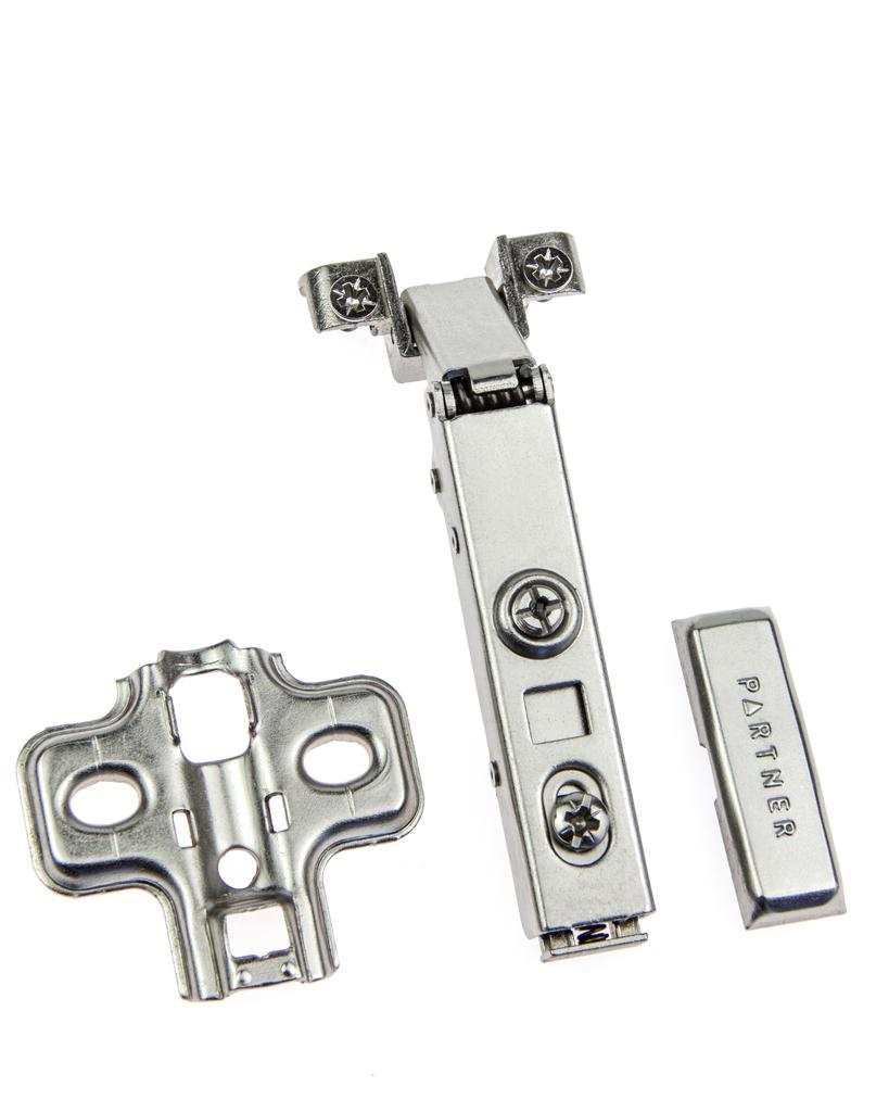 Петля четырехшарнирная для дверей с алюминиевым профилем, накладная, с ответной планкой H=0 под евровинт, угол открывания 105°, Clip-On, с заглушкой "Partner", упакована в отдельный пакет (HAS(B)090A/105/100)