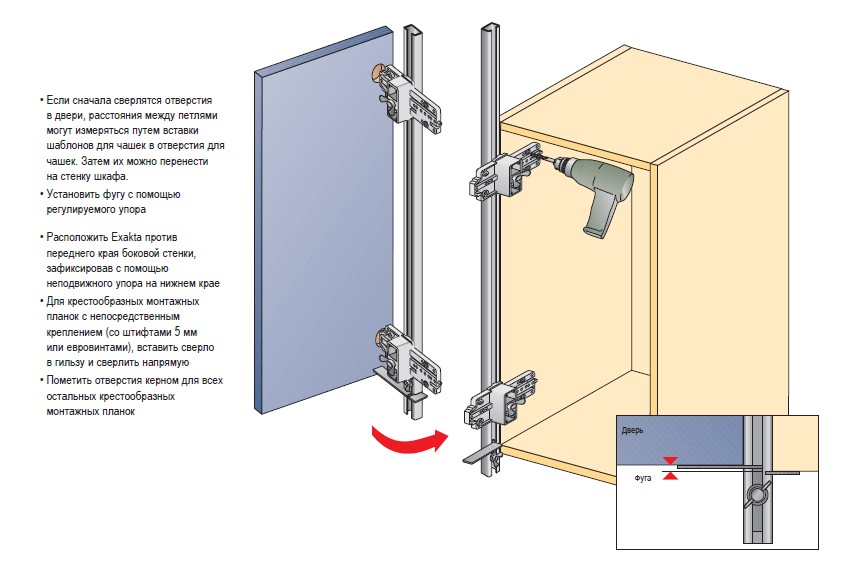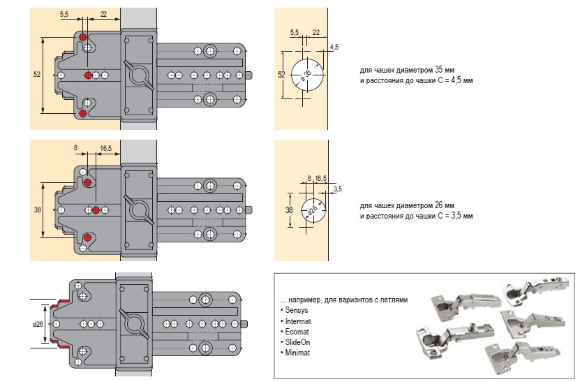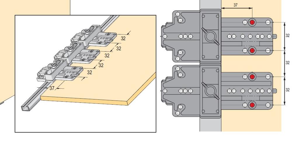 В рядах отверстий можно монтировать всю фурнитуру, обозначенную "система 32".